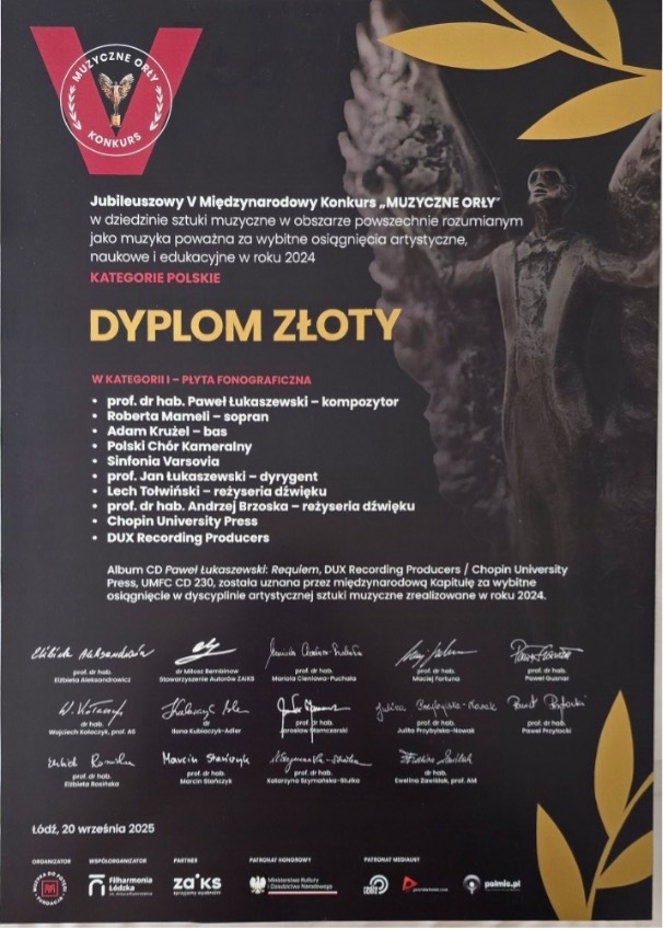 Z radością informujemy, że 7 września 2025 roku Kapituła V edycji prestiżowego Międzynarodowego Konkursu „Muzyczne Orły” ogłosiła laureatów nagród za wybitne osiągnięcia artystyczne, naukowe i edukacyjne w dziedzinie muzyki poważnej za rok 2024. Uroczysta Gala wręczenia statuetek odbyła się 20 września 2025 roku w gmachu Filharmonii Łódzkiej im. Artura Rubinsteina.