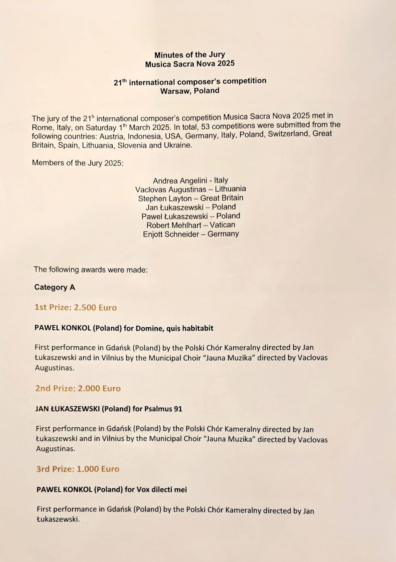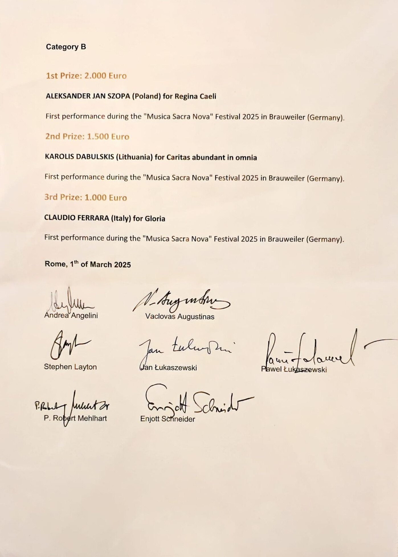 Wszyscy polscy laureaci są absolwentami lub studentami Uniwersytetu Muzycznego Fryderyka Chopina w Warszawie. Nagrodami oprócz walorów finansowych są prawykonania i nagrania w Brauwailer, Gdańsku i Wilnie, a wykonawcami będą Chór Kameralny Katedry w Kolonii, Polski Chór Kameralny i Chór Miasta Wilna Jauna Muzika.